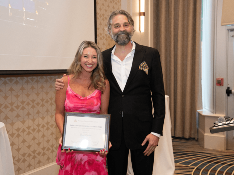 At the inaugural Emergency Medicine graduation ceremony held in May at The Vault in downtown Gainesville, Leah Everett, GME Simulation Educator, was honored with the Emergency Medicine Residency Impact Award. This award, presented by the Emergency Medicine faculty and residents, recognizes Leah’s exceptional dedication to enhancing resident education through simulation. Over the past three years, Leah has been a cornerstone of the residency program, consistently delivering high-quality, immersive learning experiences. She has coordinated monthly simulation sessions that challenge residents with realistic clinical scenarios, organized a full-scale mass casualty incident simulation to bolster emergency preparedness, and led the ever-popular Sim Wars competition. In addition, she has facilitated hands-on procedure trainings and meticulously planned the annual orientation for incoming interns, ensuring a smooth transition into residency. Leah’s passion for education, her innovative approach to simulation, and her unwavering support for residents have made a lasting impact on the program. The award is a well-deserved recognition of her tireless efforts and the vital role she plays in shaping the next generation of emergency physicians.