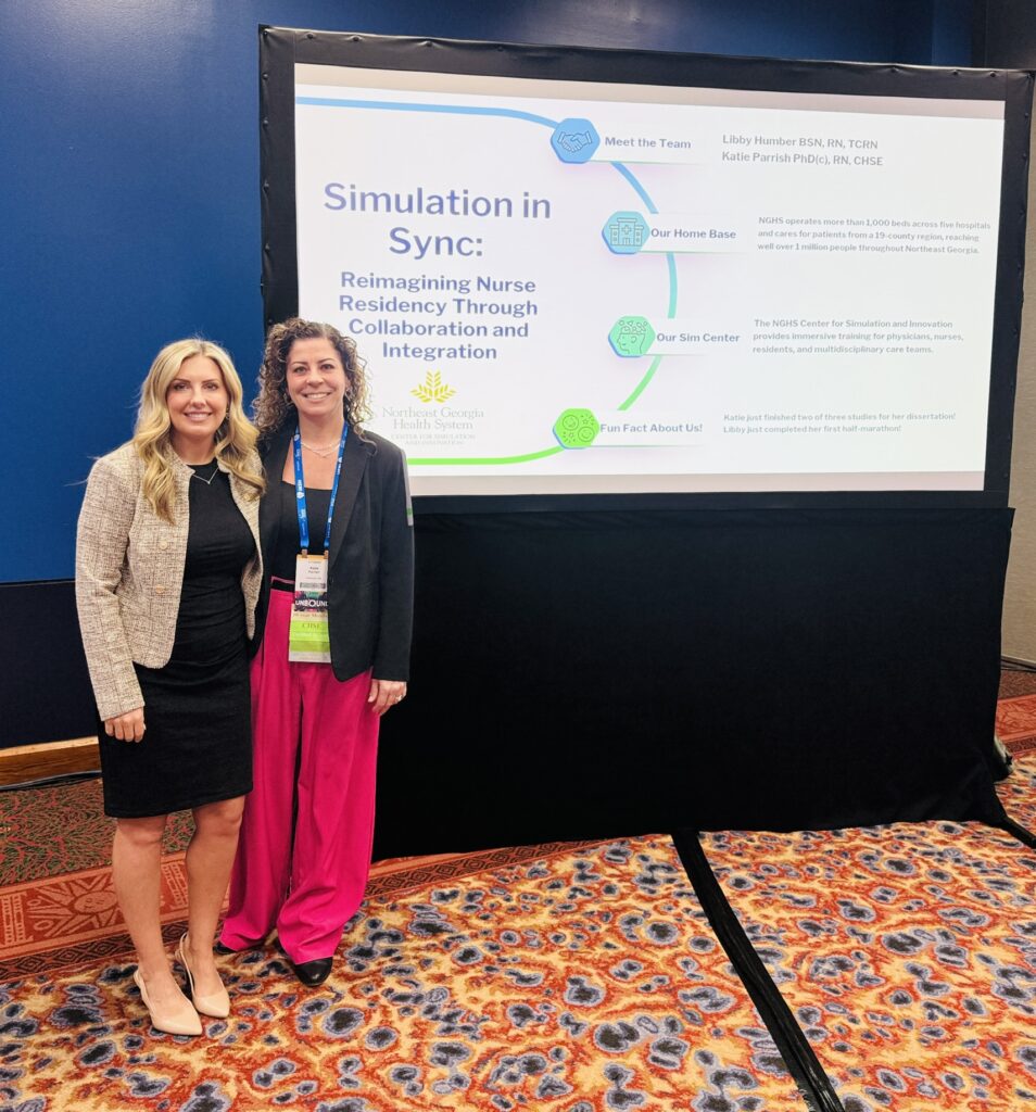 Libby Humber, BSN, RN, TCRN, and Katie Parrish, PhD(c), RN, CHSE, presentation examined the evolution of NGHS’s nurse residency simulation curriculum from basic workshop-based training to a sophisticated, stacked learning experience that threads simulation throughout the entire residency year. The session walked attendees through a detailed curriculum timeline featuring five key educational touchpoints: Midweek (introduction to simulation), End of Life (innovative active observation design), Putting It All Together (application of learning), ECCO (specialty-specific immersive scenarios), and Credentialing (simulation-based certification courses).