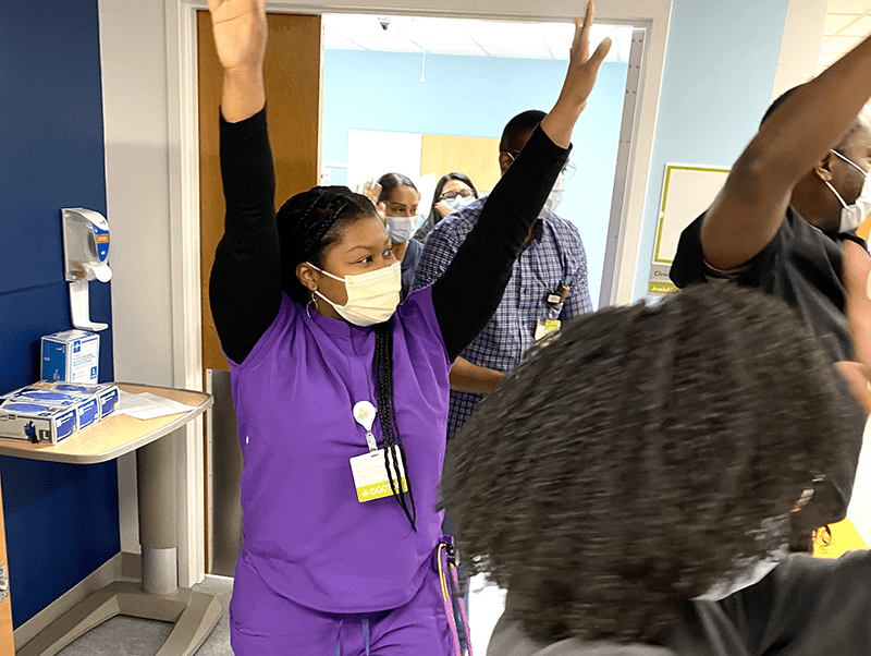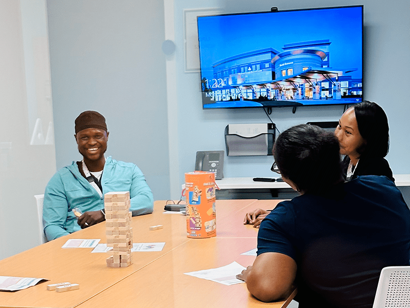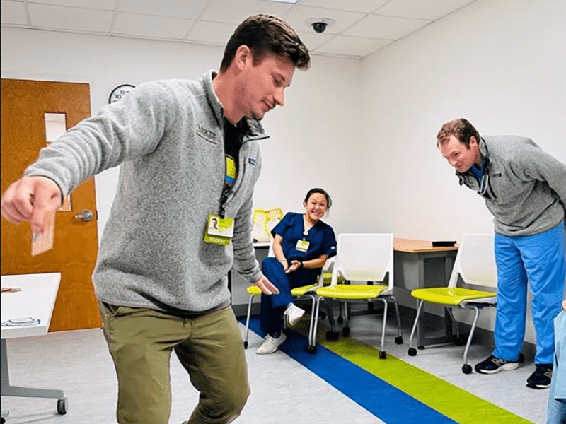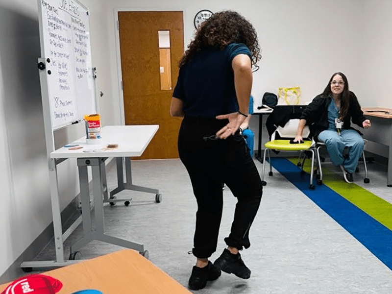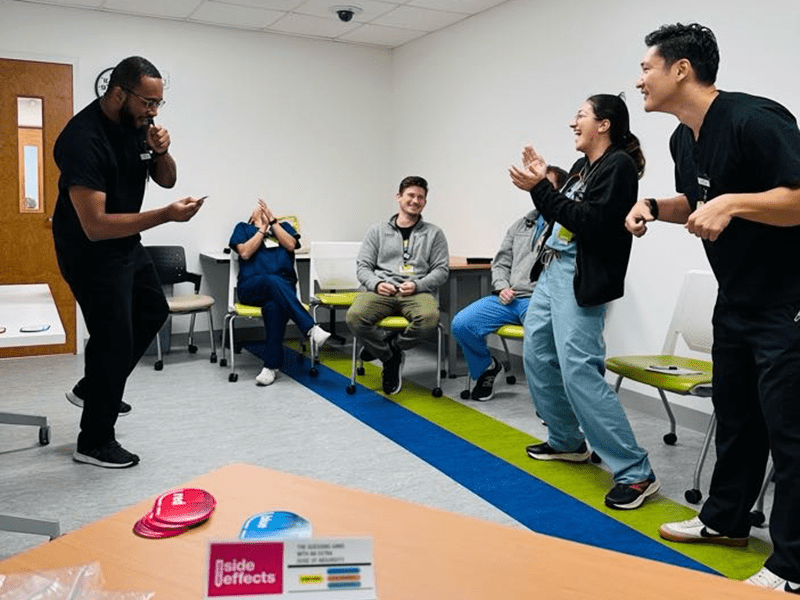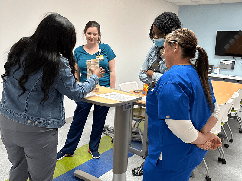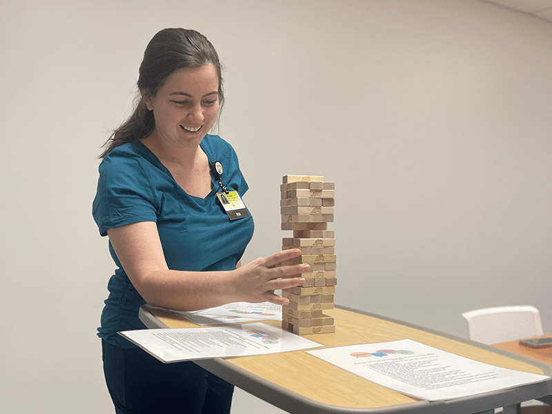 Jenga is adapted by linking each numbered block to a clinical question or prompt. As learners remove blocks, they apply knowledge related to policies, procedures, and diagnoses in an interactive, low-stakes environment.