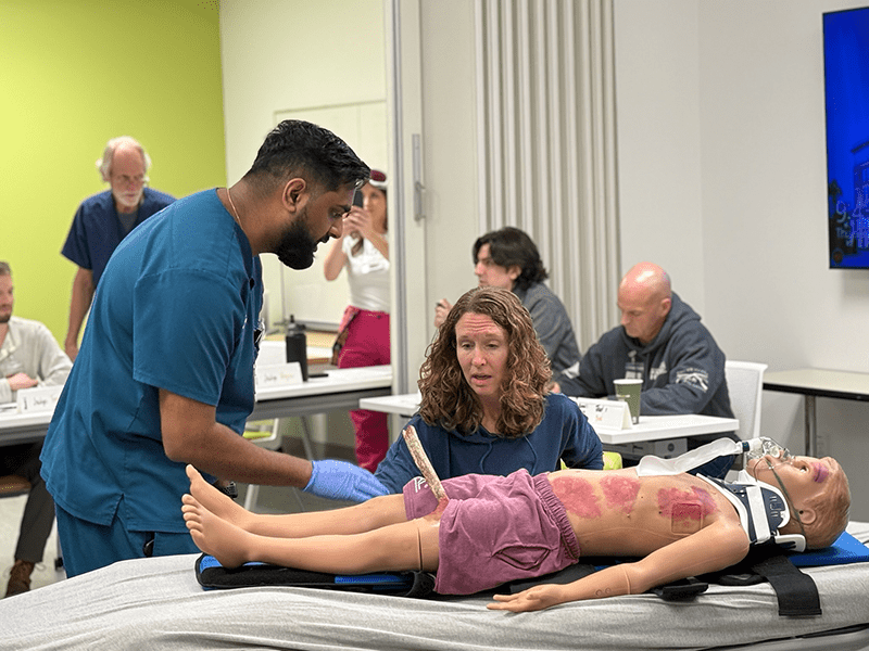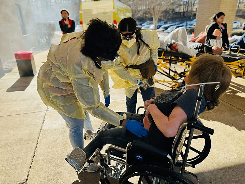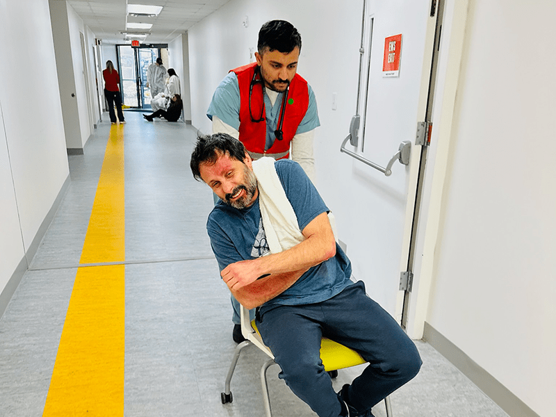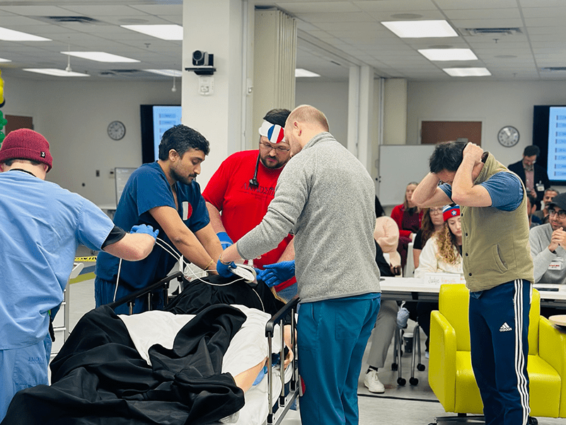 The mock mass casualty incident immerses learners in a high-acuity, high-volume scenario requiring triage, prioritization, and coordinated team communication. The activity reinforces disaster response and system-based practice.