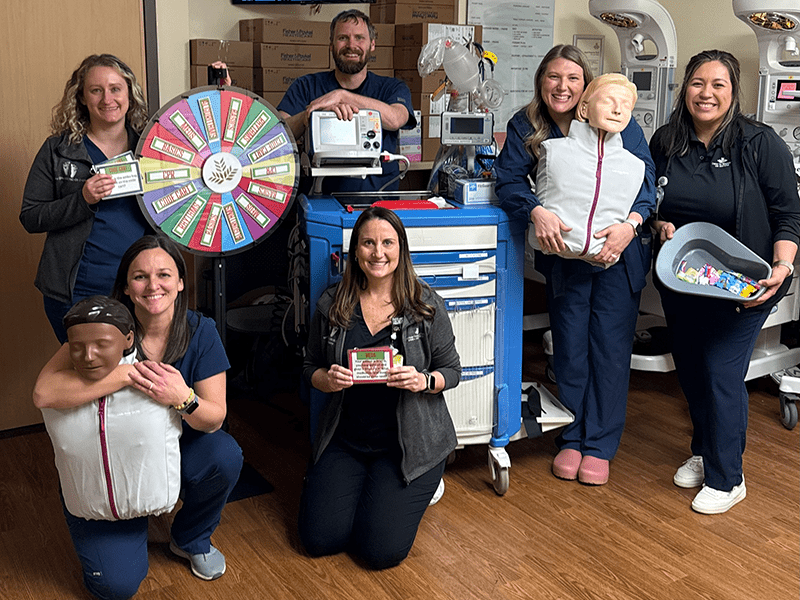 A customizable wheel is used to assign topics such as ACLS, PALS, and OB emergencies. Learners respond to scenario-based prompts tied to each category, reinforcing clinical knowledge, prioritization, and team discussion in an interactive format.